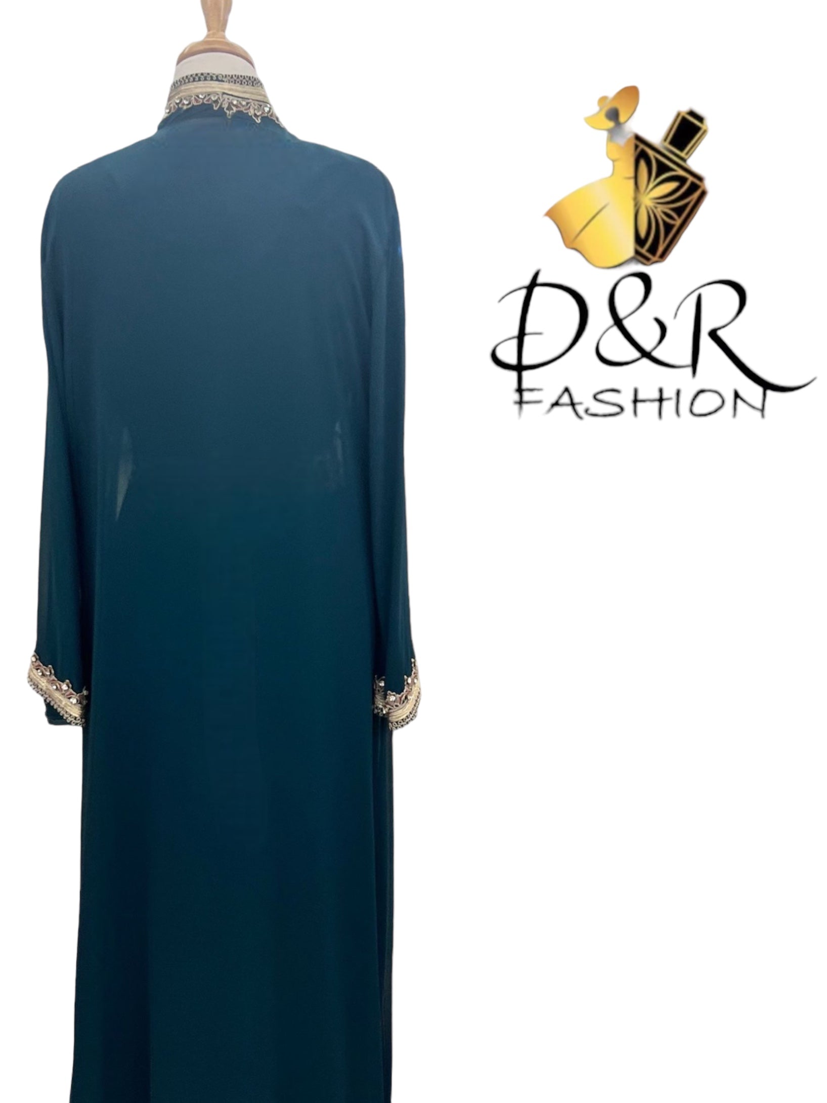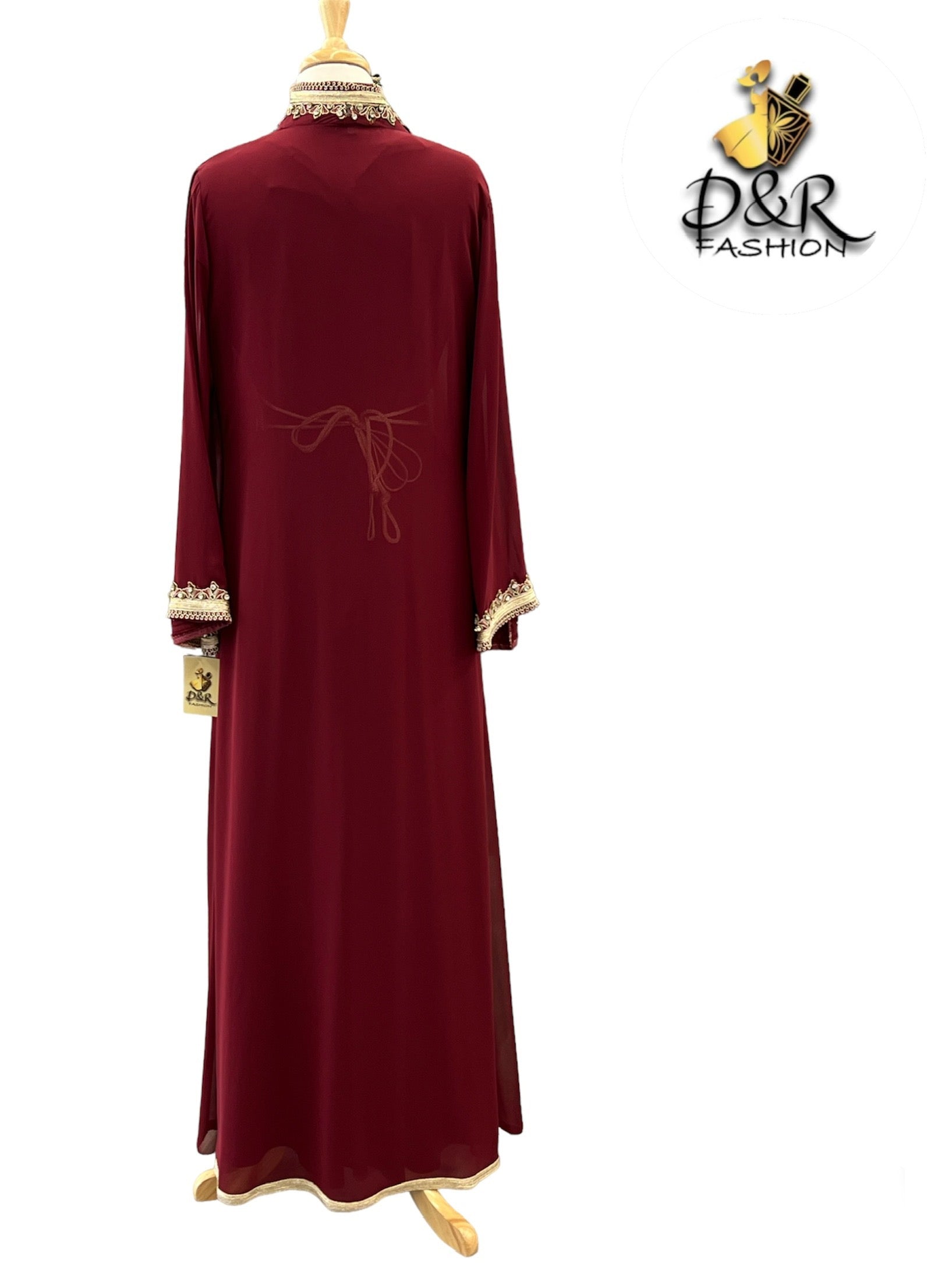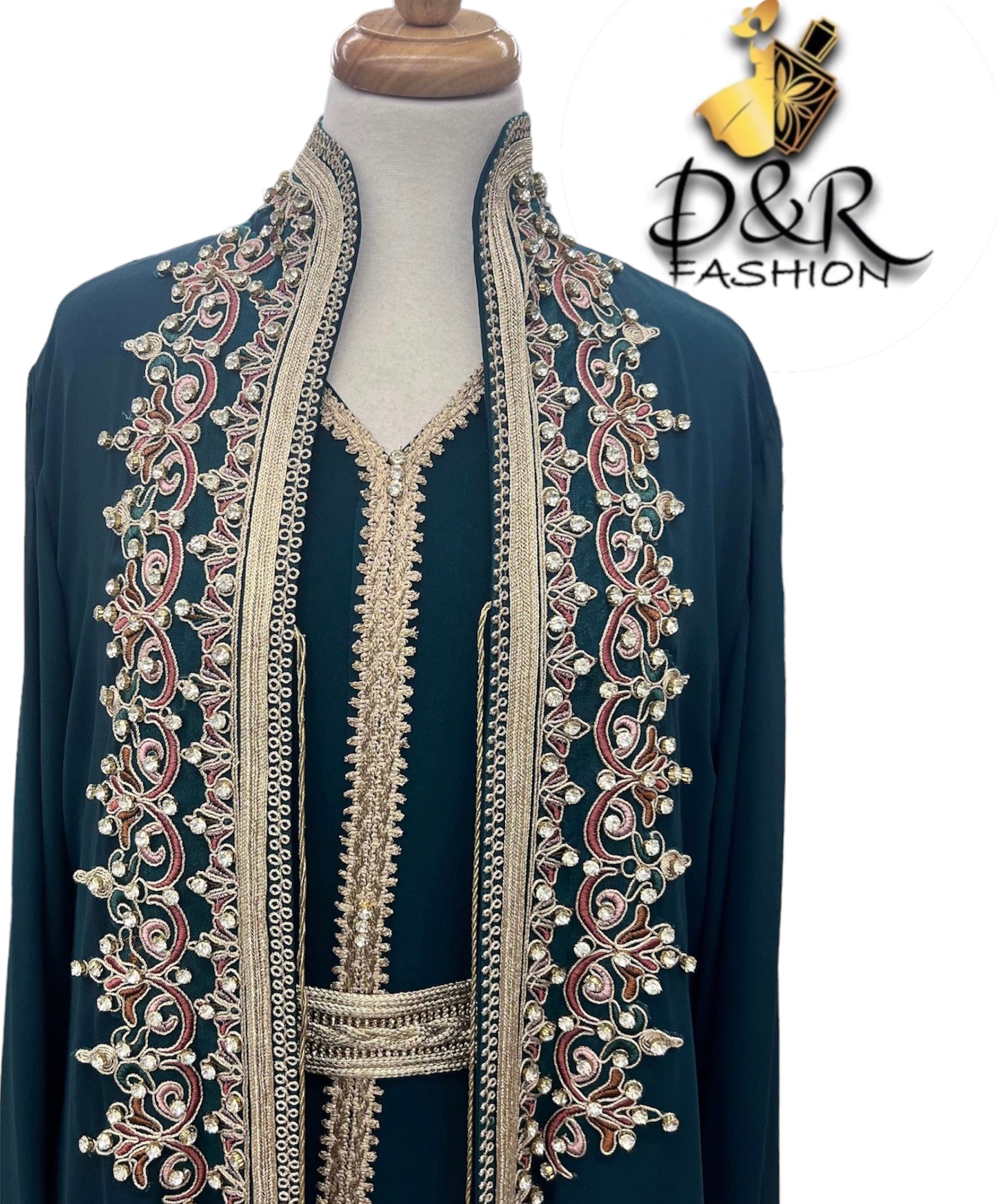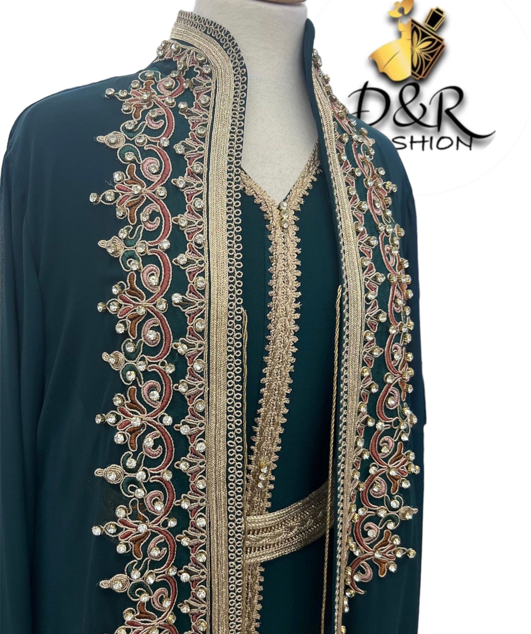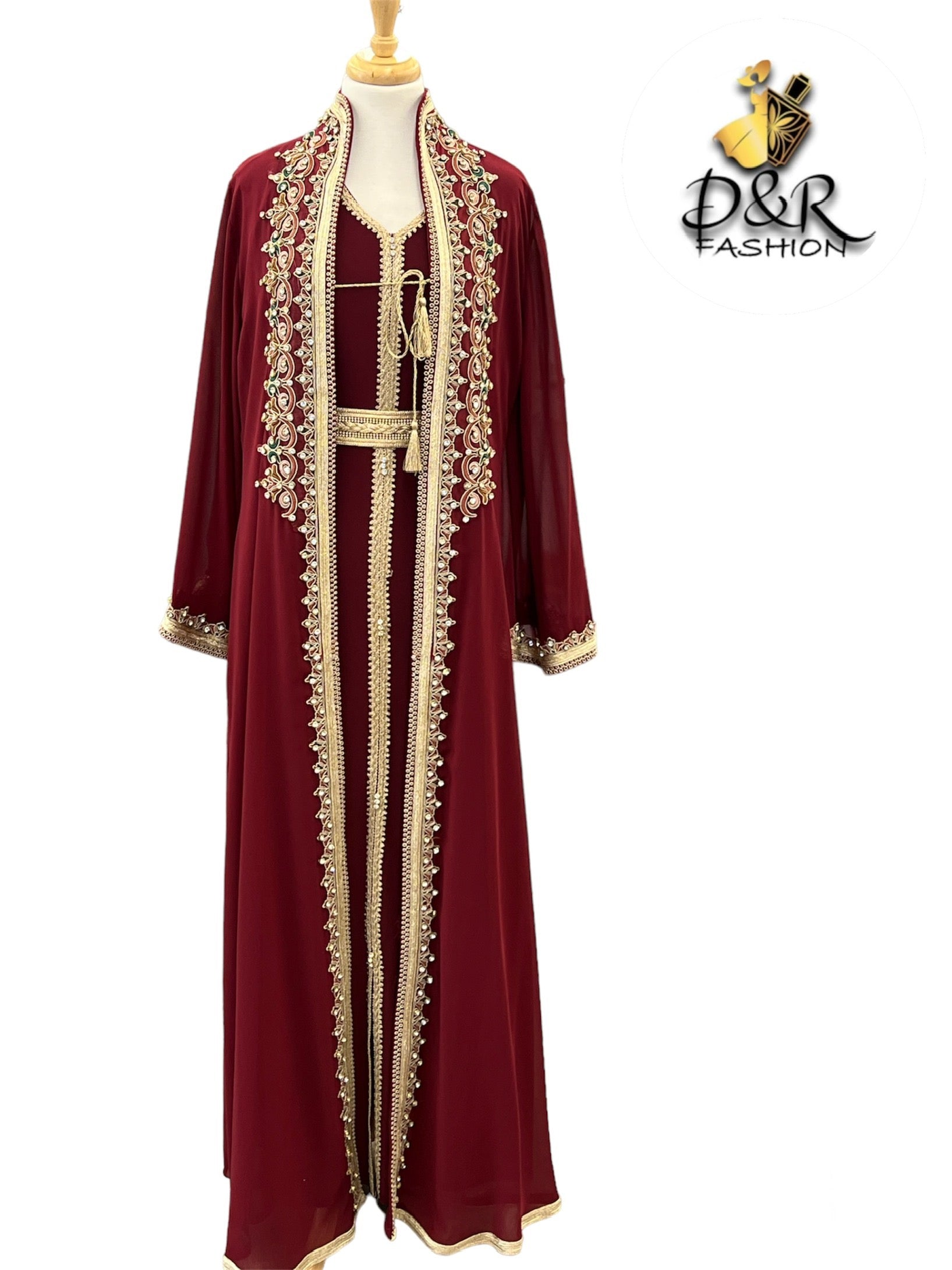 Traditional Moroccan long sleeve 2piece Kaftan hand embroidery, chiffon top piece and polyester bottom piece, belt included.