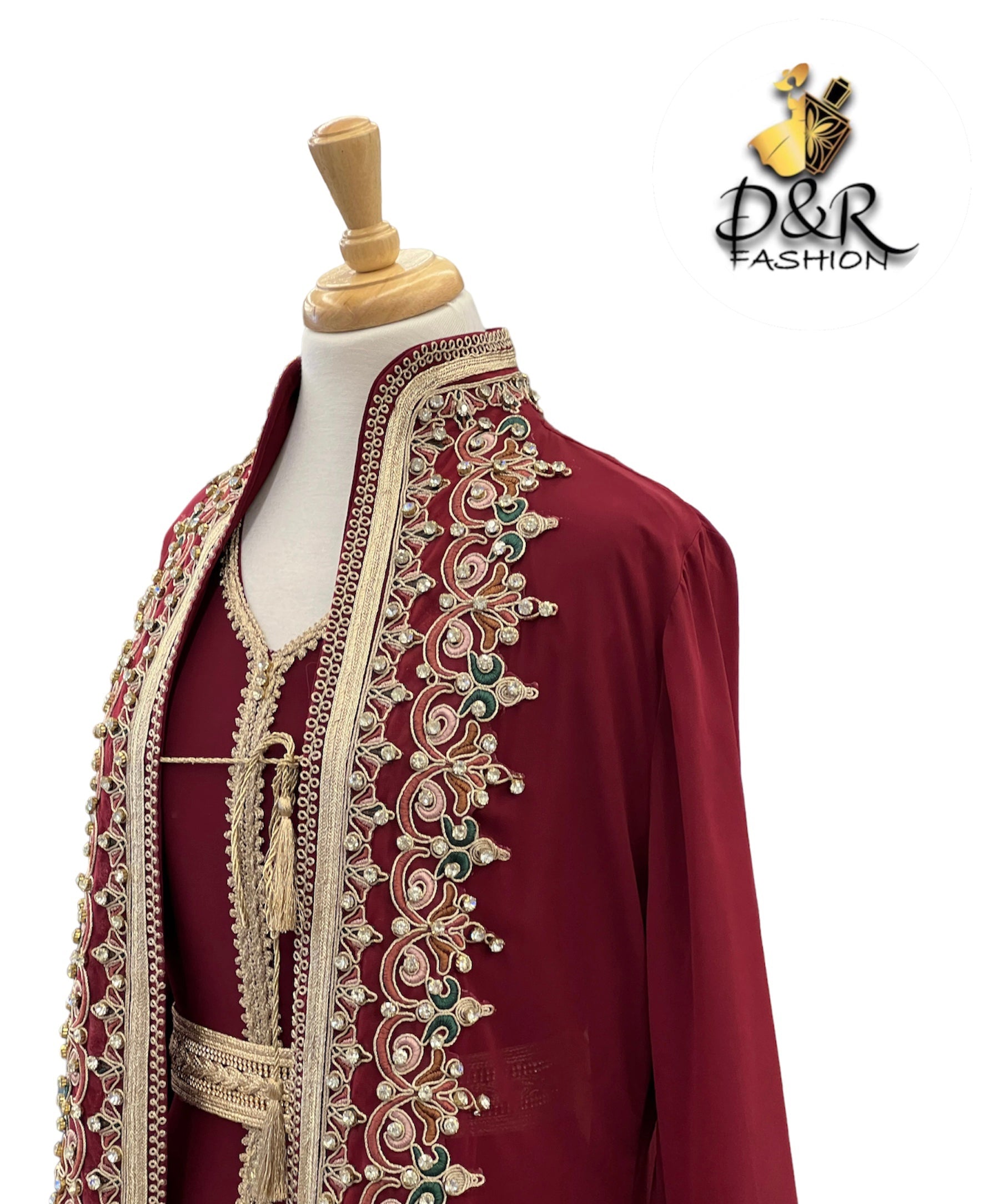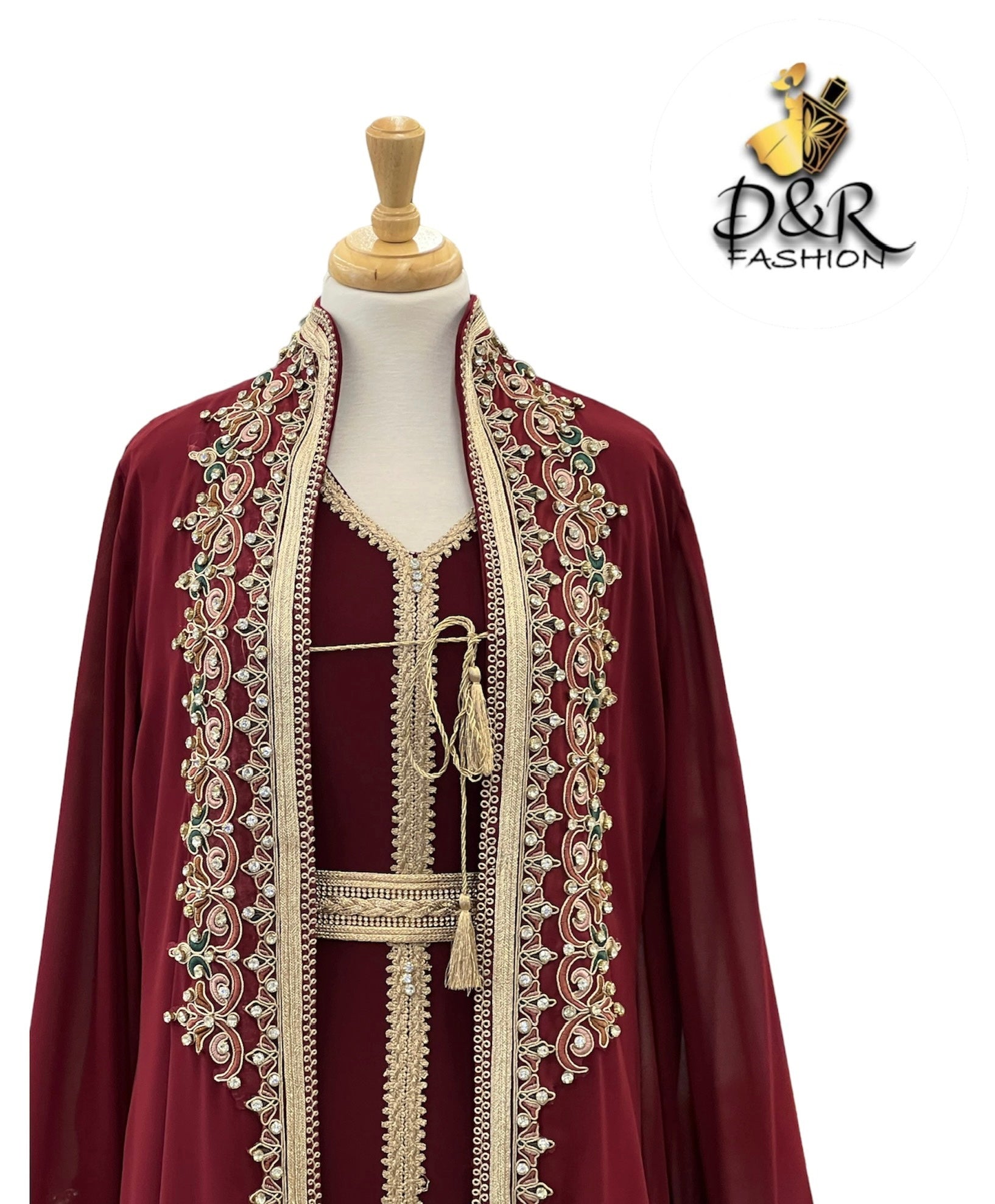 قفطان مغربي تقليدي بأكمام طويلة 2 قطعة تطريز يدوي ، قطعة علوية من الشيفون وقطعة سفلية من البوليستر ، حزام متضمن.