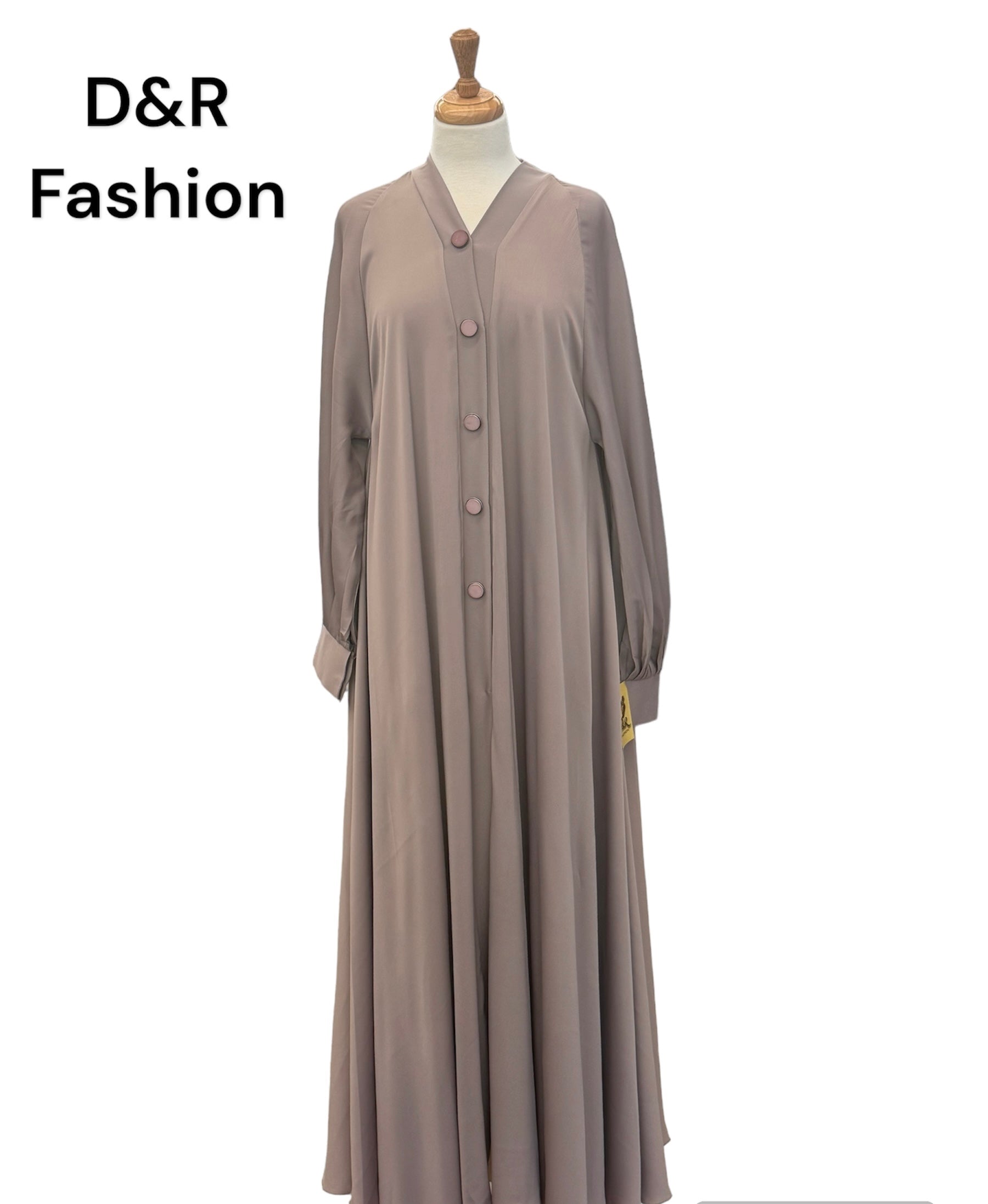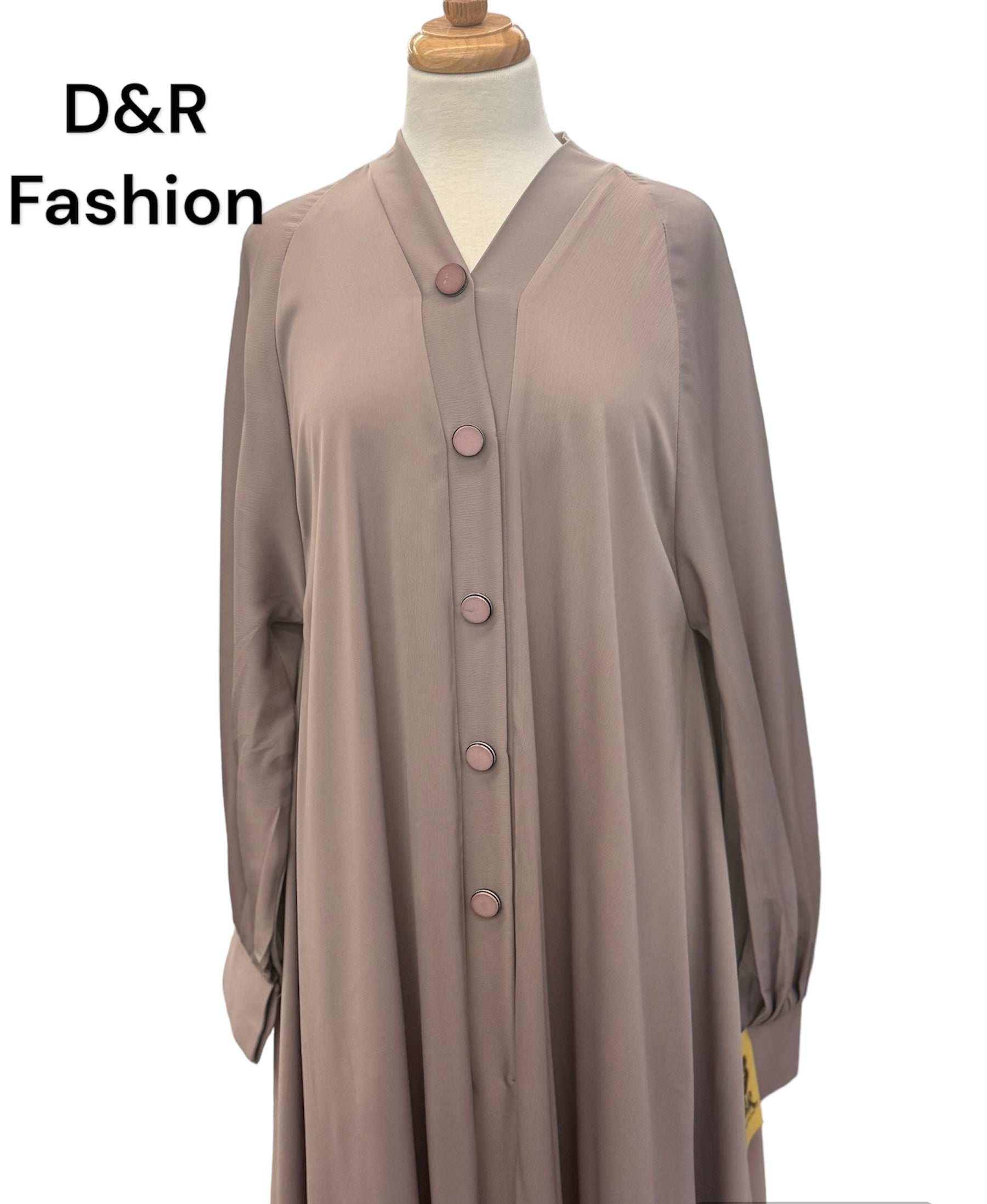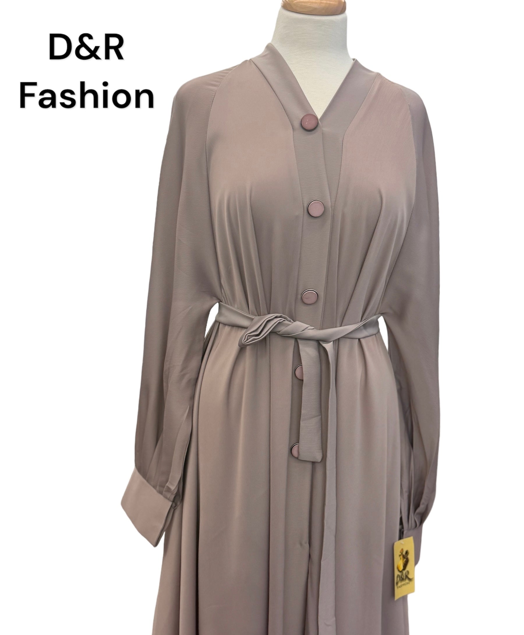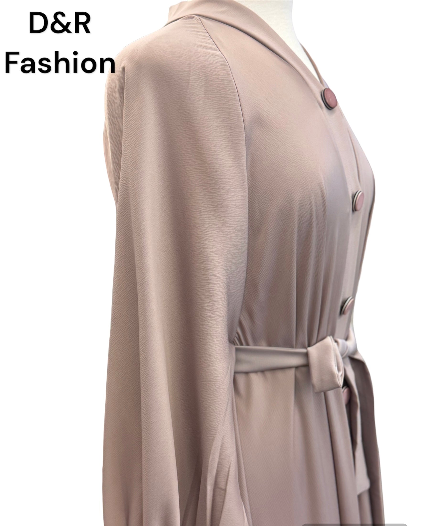 Elegant, flowy, open abaya in nude color from Dubai made of high quality fabric with large buttons on the front, Comes with a matching color scarf and belt.