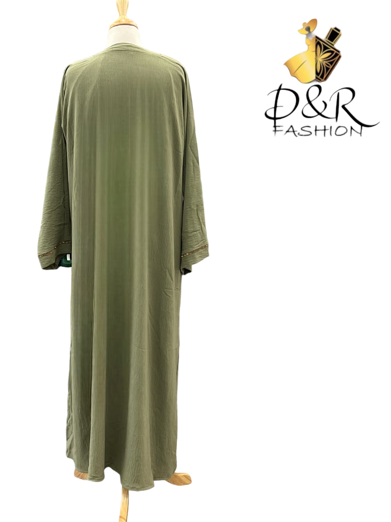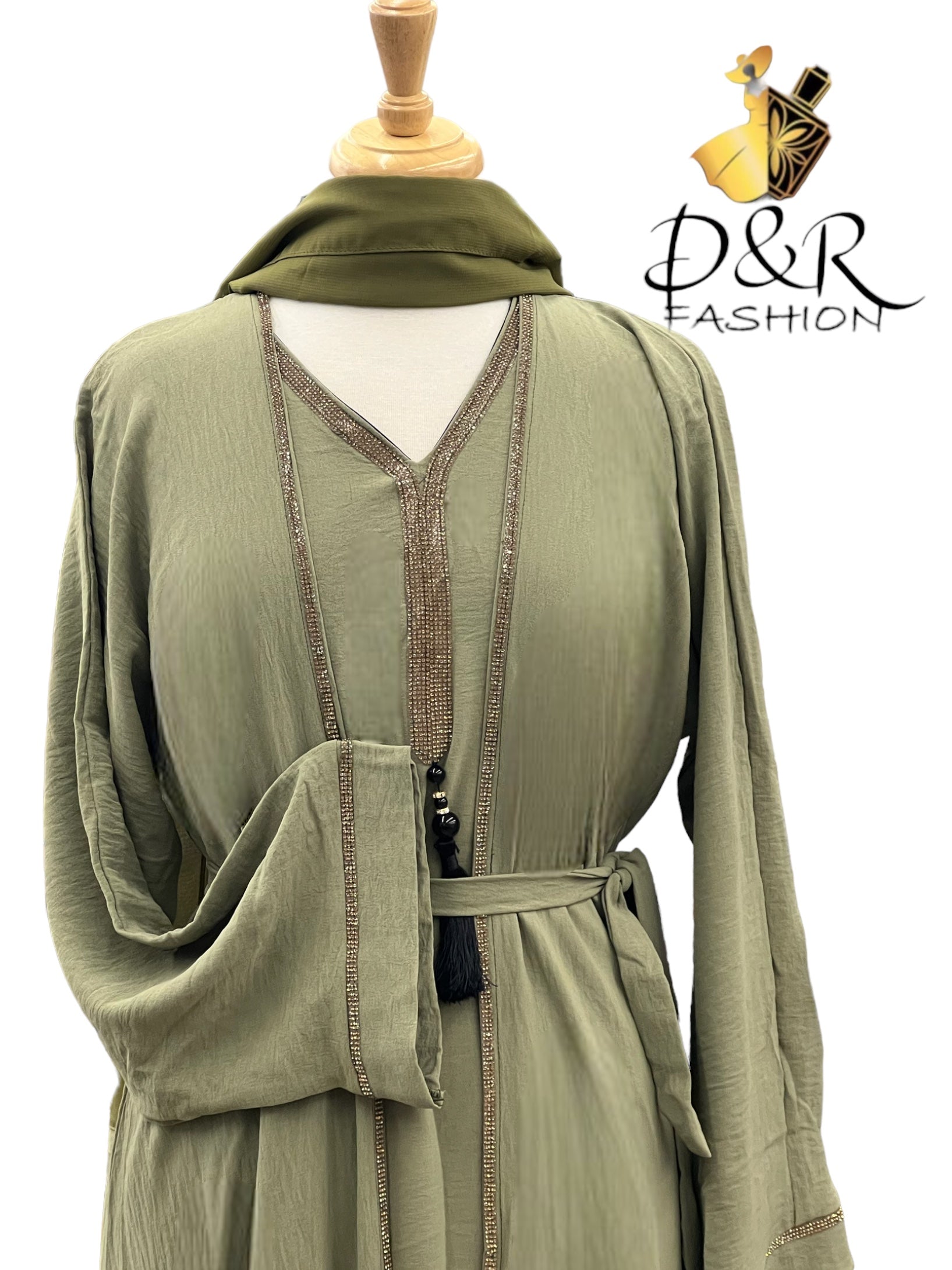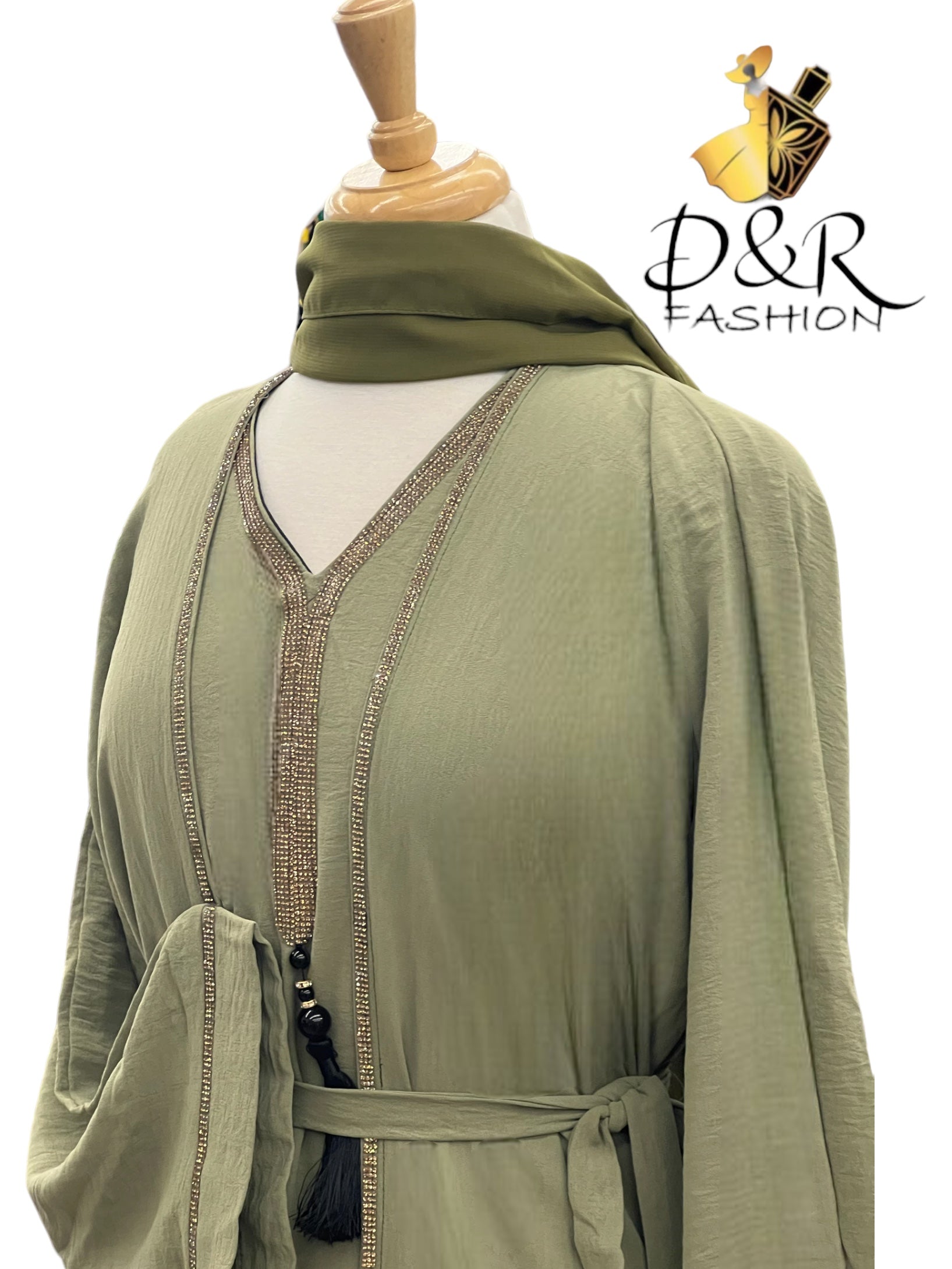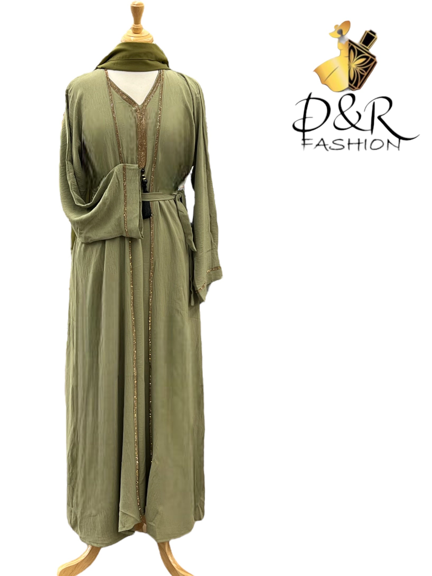 Two-piece abaya from Dubai made of high-quality fabric with a golden stripe on the front and cuffs that add a charming touch to it. It comes with short sleeves underneath dress and a matching color scarf and belt.