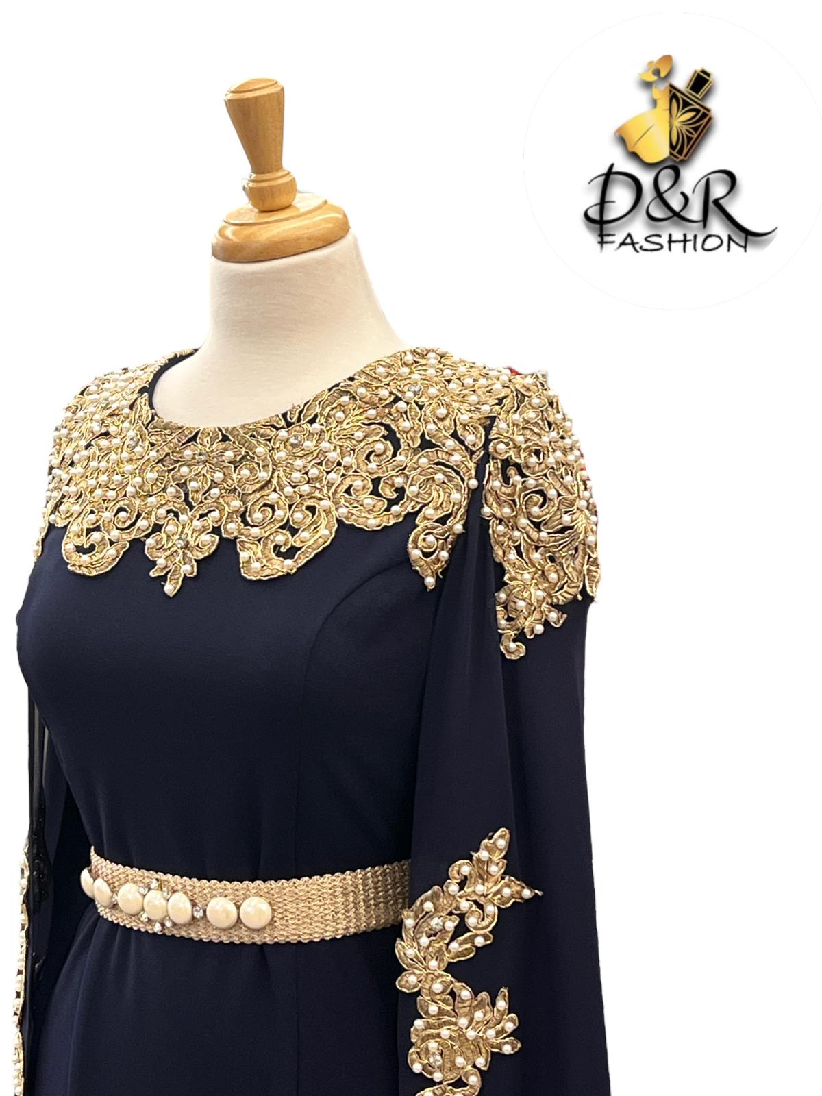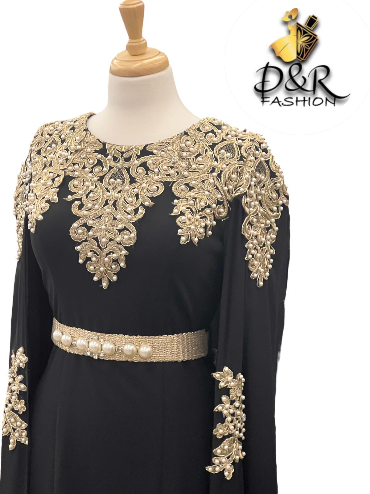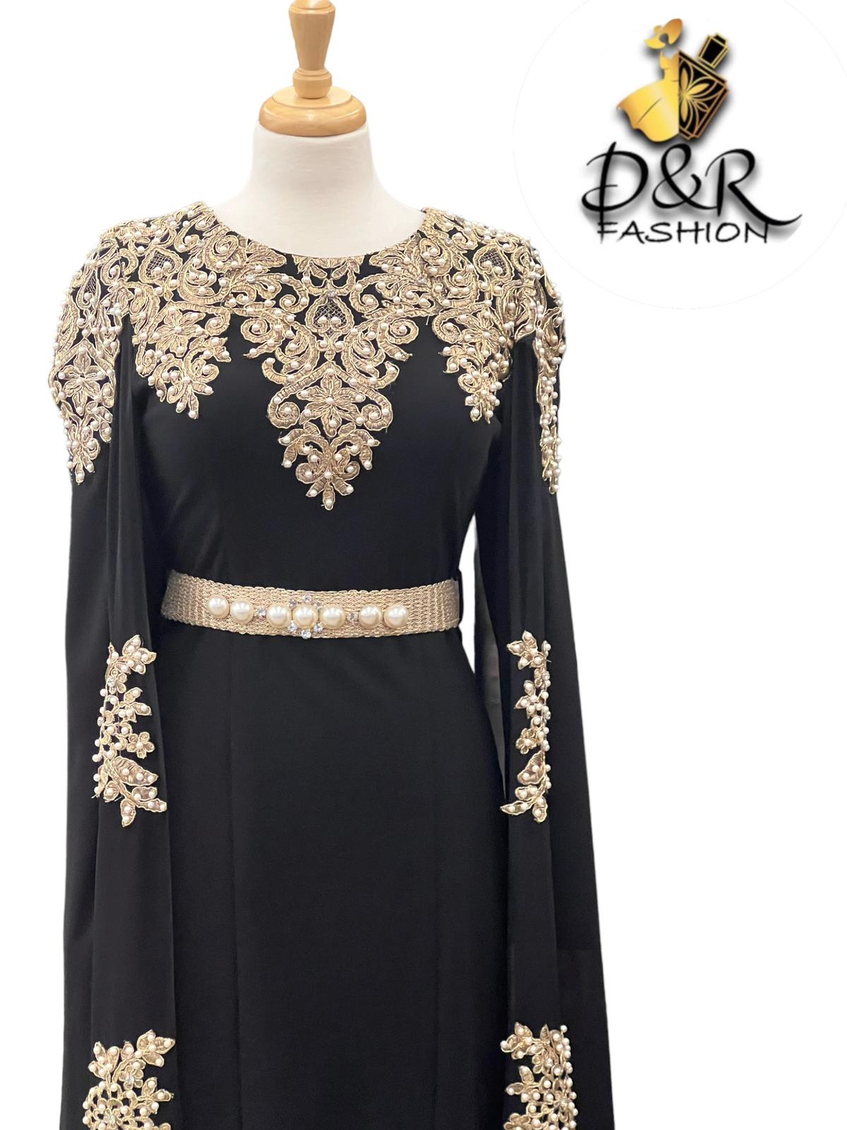 The gorgeous and stylish Kaftan is decorated with a mixture of crystal beads and rhinestones. Embroidered with high-quality materials, it has a luster and charm that enhances your beauty in a unique way.