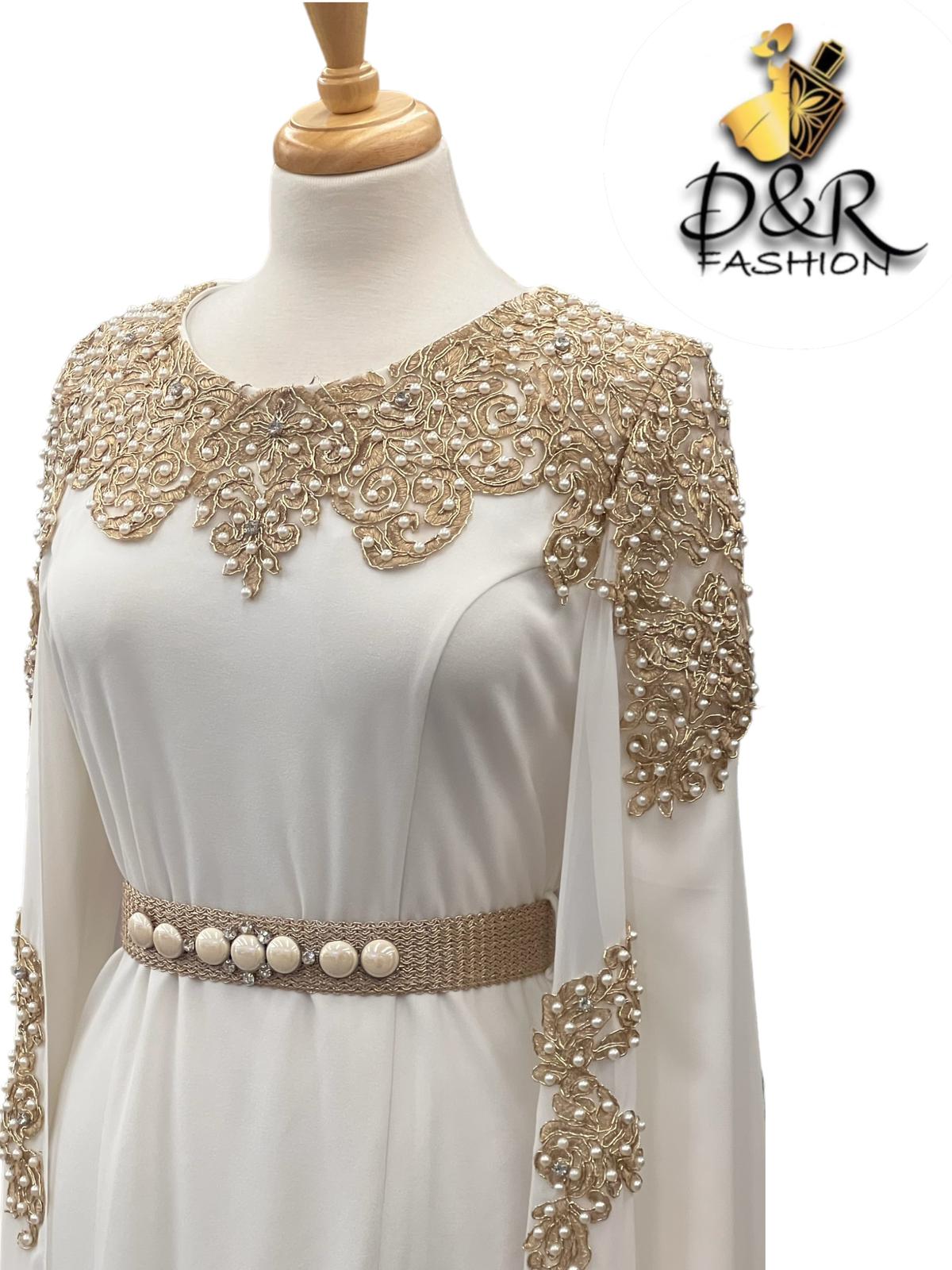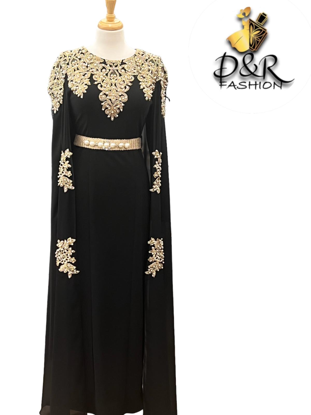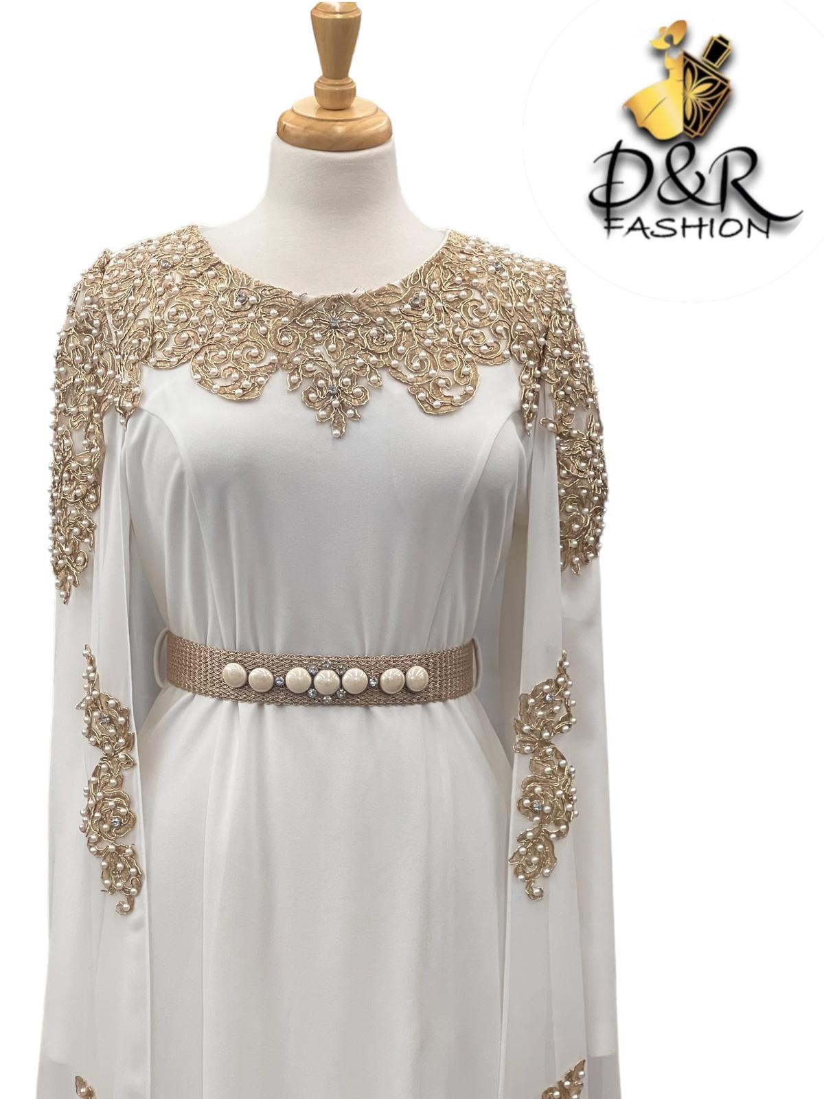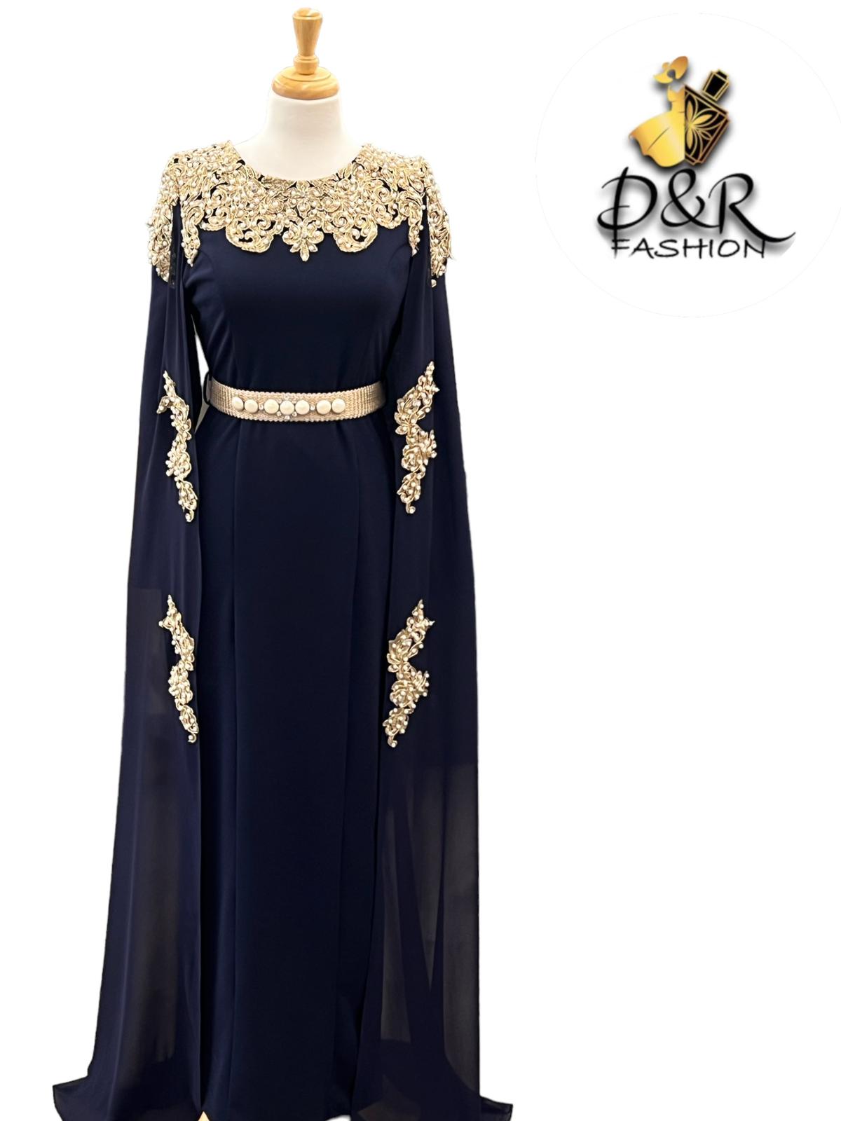 The gorgeous and stylish Kaftan is decorated with a mixture of crystal beads and rhinestones. Embroidered with high-quality materials, it has a luster and charm that enhances your beauty in a unique way.