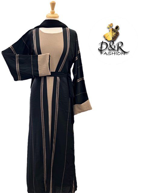 An open abaya made of high quality fabric from Dubai, embroidered with beads on the front, comes with a matching colors scarf and belt.