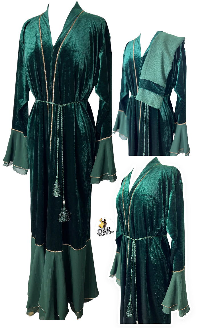 Velvet abaya from Dubai with unique golden lines and ruffles on the front, sleeves and hem of the abaya comes with a scarf and belt in the same color.